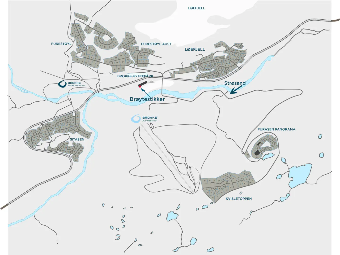 Brøytestikker finn du i garasjene i sentrum av Brokke, vendt mot Brokke Camping, mens sand finn du i lageret på vegen opp mot Kvisletoppen. Sjå kart under. Der kan du hente det du treng av brøytestikker til tunet ditt, samt strøsand om du treng det.